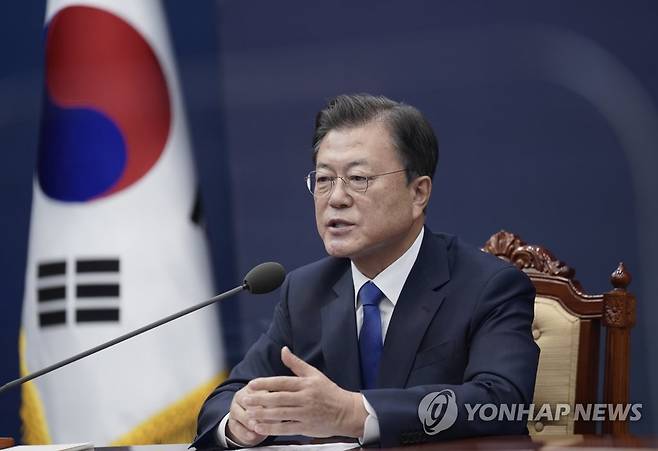 (서울=연합뉴스) 최재구 기자 = 문재인 대통령이 17일 오후 청와대 여민관 영상회의실에서 화상으로 열린 '에너지 및 기후에 관한 주요 경제국 포럼(Major Economies Forum on Energy and Climate, MEF)'에 참석해 발언하고 있다. 2021.9.17