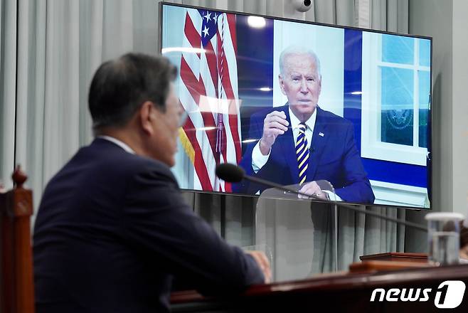조 바이든 美 대통령 개회사 지켜보는 문대통령
