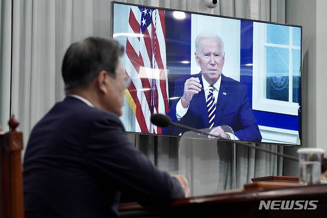 [서울=뉴시스] 전진환 기자 = 문재인 대통령이 17일 오후 청와대 여민관 영상회의실에서 화상으로 열린 '에너지 및 기후에 관한 주요 경제국 포럼(Major Economies Forum on Energy and Climate, MEF)'에 참석해 조 바이든 미국 대통령의 개회사를 듣고 있다. 2021.09.17. amin2@newsis.com
