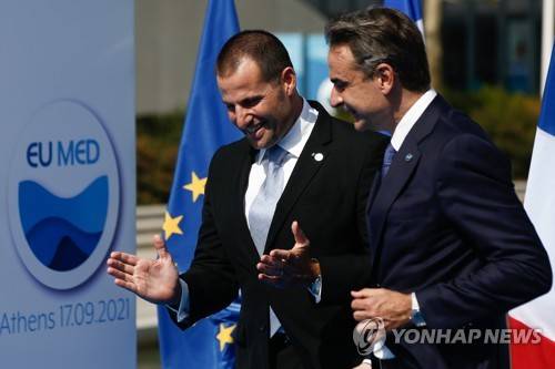 epa09473463 Greek Prime Minister Kyriakos Mitsotakis (R) welcomes Malta Prime Minister Robert Abela (L), at the EUMed9 Summit, in Athens, Greece, 17 September 2021. The agenda of the Summit, which acquires special geopolitical weight, includes security challenges in the Mediterranean that endanger stability in the region, potential new crises, such as the threat of migration flows after the latest developments in Afghanistan. EPA/YIANNIS KOLESIDIS