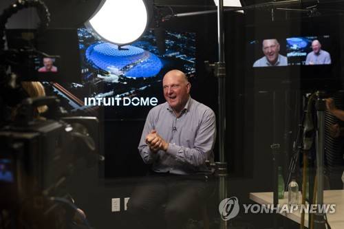 Los Angeles Clippers owner Steve Ballmer talks to a reporter during an interview as a rendering of the proposed arena for the Clippers appears on a display behind him Thursday, Sept. 16, 2021, in Los Angeles. (AP Photo/Jae C. Hong)