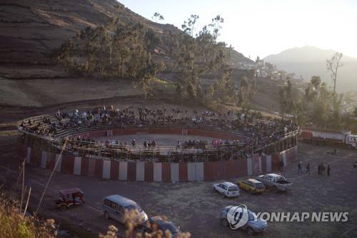 FILE - In this July 16, 2013 file photo, people hold a bullfight in Lachaqui, Peru. A Sept. 16, 2021 court decision prohibited the training children in the sport. (AP Photo/Martin Mejia, File) JULY 16, 2013 PHOTO
