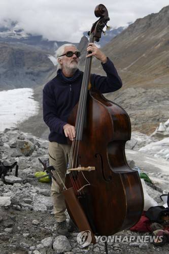 Patrick Peikert, Director of Zermatt Music Festival, plays a Double bass next to the Monte Rosa Hut (2883m), during the Zermatt Music Festival and Academy, above Zermatt, Switzerland, on Thursday, 16 September 2021. (Anthony Anex/Keystone via AP)