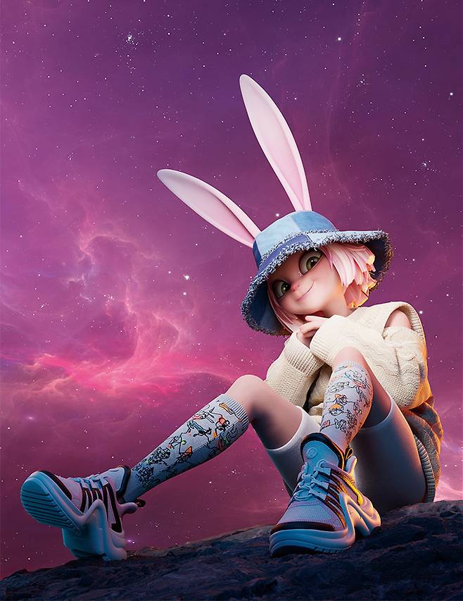 A : 사람들에게 한층 친근하게 다가가기 위해 80~90년대 지구에서 발행된 패션 매거진과 당시 유명했던 셀러브리티의 스타일을 자주 참고한다. 이번 활동에서는 귀를 접어서 양옆으로 늘어뜨려 봤는데 반응이 좋았다.