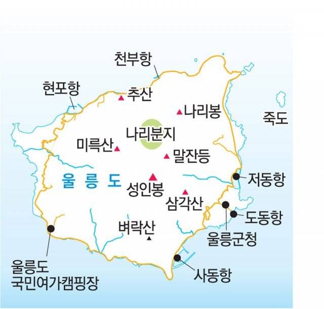 울릉도의 밤 해변에는 ‘어화(漁火)’ 꽃이 핀다. 오징어 잡이 어선이 집어등을 밝힌 불이 밤바다에 두둥실 떠 있는 어화는 울릉팔경 중의 하나다. 울릉도의 원시림 속에는 각종 약초가 있고, 해안절벽에는 수령 2000년이 넘는 향나무 군락지가 있다. 특히 울릉도의 무성한 대나무 숲은 특산품인 오징어를 건조하는 데 꼭 필요한 재료를 제공한다. 대나무 한 그루 없는 독도를 ‘죽도(竹島)’라고 부르는 것은 어불성설이다. 한반도 본토에서는 볼 수 없는 신기한 꽃과 나무로 가득한 울릉도 숲으로 떠나자.