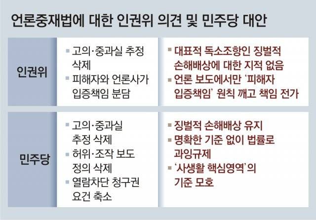 이날 인권위가 핵심 독소 조항은 그대로 둔 의견을 밝힌 동시에 민주당 역시 독소 조항을 고수함에 따라 인권위와 민주당이 짜맞추기식 행보를 보인다는 비판이 나온다. 심석태 세명대 저널리즘스쿨 교수는 “인권위가 입증 책임을 분담하는 조항을 신설해야 한다는 판단을 하면서 징벌적 손해배상에 대한 언급은 하지 않았다”며 “이에 따르면 최대 5배까지 손해배상을 묻도록 하되 피해자의 입증 책임은 덜어 오히려 언론의 부담이 과중될 수 있다”고 경고했다.