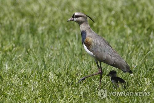 epa09473991 A southern lapwing 'Vanellus chilensis' protects a chick in Medellin, Colombia 17 September 2021. A pair of southern lapwings put their nest on the soccer field of the Sports Unit of Belen, which caused its closure as the birds raise its chicks and they learn to survive. EPA/Luis Eduardo Noriega A.