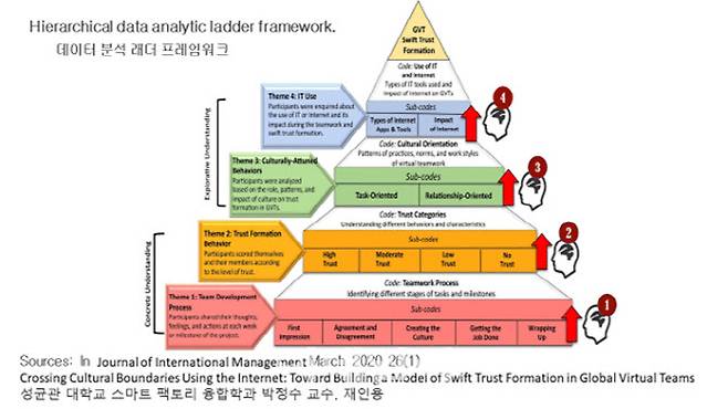 아래 그림은 코딩 작업을 할 때의 안내서로서 코드 북(code book)을 계층적 데이터 분석 래더 프레임워크(hierarchical data analytical ladder framework)를 따르도록 설계하는 체계를 보여주고 있다. 먼저 X-Culture 프로젝트 전반에 걸쳐 팀원들이 어떻게 협업했는지 이해하기 위해 GVT 개발 프로세스를 5단계로 나누어 생각해야 한다. 팀 개발 프로세스 테마를 첫 번째 레이어(layer)로 사용된다. 둘째, 각 팀 프로세스를 신뢰 형성 행동 및 특성과 일치시켜 코딩한다. 마지막으로, 다양한 신뢰 패턴을 개선하여 높은 신뢰, 보통 신뢰, 낮은 신뢰 및 무 신뢰의 4가지 뚜렷한 행동 세트를 식별할 수 있어야 한다. 그런 다음 인터넷 문화의 효과는 다양한 과제 지향 역할과 관계 지향 행동의 패턴을 식별함으로써 글로벌 가상 팀(GVT)의 신속한 신뢰 형성에 대한 인터넷의 영향을 보여주고 있다.