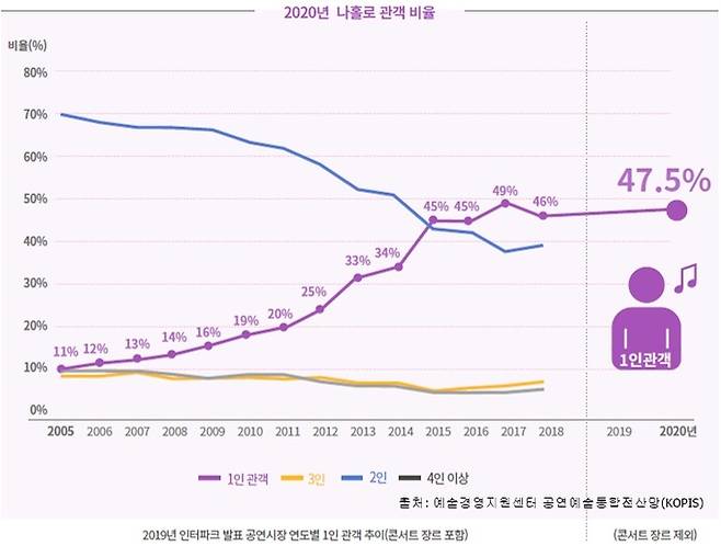 예술경영지원센터 '월간 공연전산망'에 따르면, 2020년 공연(콘서트 제외) 관객 중 나홀로 관객 비중이 47.5%를 차지했다.