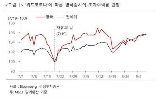 18일 금융투자업계에 따르면 영국은 지난 7월 높은 백신 접종률을 기반으로 방역규제를 완화한 이후 주식시장이 글로벌 대비 강세를 보였다. 리딩투자증권이 분석한 영국의 위드 코로나 이후 한달간 누적초과수익률은 최대 3%로, 글로벌 업종지수 대비 초과수익률 기준으로 경기소비재(7.3%p), 에너지(5.1%p), IT(3.7%p), 산업재(3.4%p) 등에서 나타났다. 곽병렬 리딩투자증권 연구원은 "위드 코로나로 인한 경제 정상화 기대감은 내구재 소비심리 개선과 관련해 경기소비재와 IT 업종, 경제봉쇄 해제로 인한 생산시설 가동률 정상화 가능성은 에너지와 산업재 업종 등의 강한 반등과 연동됐을 것으로 추정한다"고 설명했다.