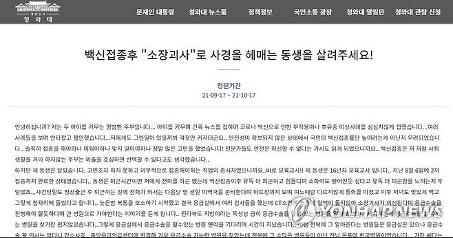 (전주=연합뉴스) 18일 청와대 국민청원 게시판에 신종 코로나바이러스 감염증(코로나19) 백신을 맞은 보육교사가 소장 괴사로 사경을 헤매고 있다는 가족의 청원 글이 게시돼 있다. 2021.9.18 [청와대 홈페이지 캡처. 재판매 및 DB금지]