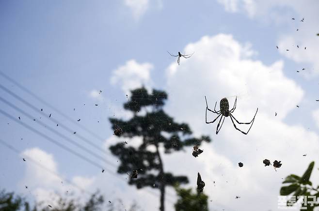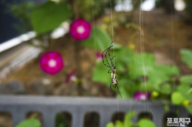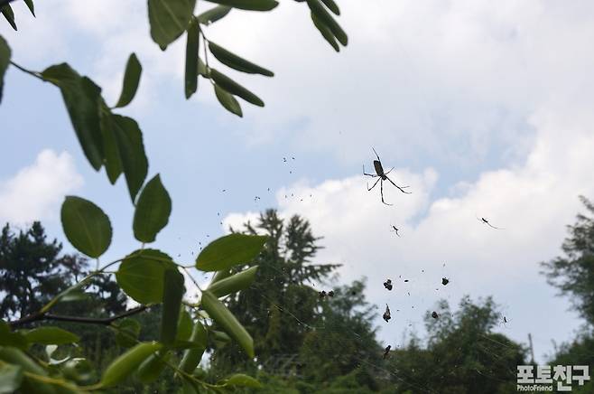 가을 무당거미가 포인터 좋은 곳에 거미줄 낚시 펴 놓고 월척을 기다리고 있습니다.