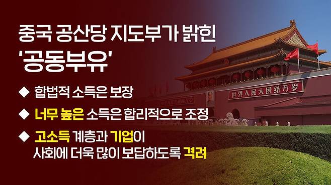 "공동부유(共同富裕)는 사회주의의 본질적 요구이며, 중국식 현대화의 중요한 특징이다. 질 높은 발전 속에서 공동부유를 촉진해야 한다."