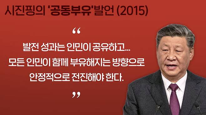 사실, '공동부유'는 시진핑이 처음 쓴 말이 아니라 덩샤오핑 치하에서 나온 개념이다. 1992년 중국공산당 14차 당 대회에서 통과된 당장(당의 헌법) 수정안에 처음 등장했다. 1992년이면 덩샤오핑이 '남순강화'를 하며 개혁개방을 지휘하던 시절이니 당연히 그의 승인을 받았을 것이다. 2012년 11월 시진핑이 당 총서기에 취임할 때, 자리를 물려주던 후진타오가 "전체 인민의 공동부유를 점진적으로 실현하고, 부강·민주·문명·조화로운 사회주의 현대화 국가를 건설해야 한다"고 과제로 제시하기도 했다.