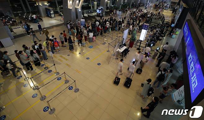 (서울=뉴스1) 정진욱 기자 = 추석 황금연휴 첫날인 18일 오전 서울시 강서구 김포공항에서 제주로 향하는 관광객들이 탑승수속을 하고 있다. 제주도관광협회에 따르면 17일부터 22일까지 추석연휴 엿새간 항공기와 선박 예약 건수를 기준으로 전망한 관광객은 21만5000여명이다. 2021.9.18/뉴스1