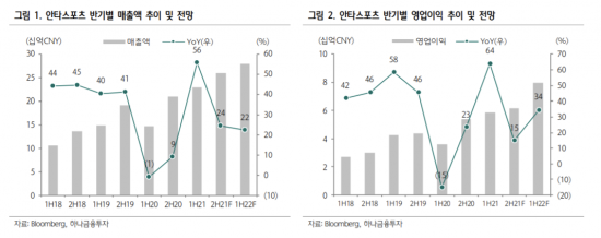 상반기 안타 스포츠의 매출액은 전년동기대비 56% 늘어난 228억위안 시장 예상치를 4% 상회했다. 순이익은 38억위안으로 1년 전보다 132% 증가했다. 회사의 이커머스 매출액은 1년 전보다 높은 기저에도 불구하고 61% 증가해 매출액 27%가량 기여했다.