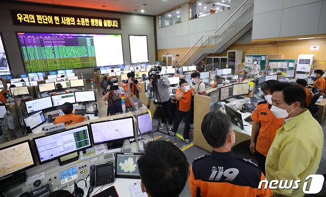 (서울=뉴스1) 신웅수 기자 = 오세훈 서울시장이 추석 연휴 첫날인 18일 오전 서울 중구 서울종합방재센터를 방문해 종합상황실을 살펴보고 있다. 2021.9.18/뉴스1