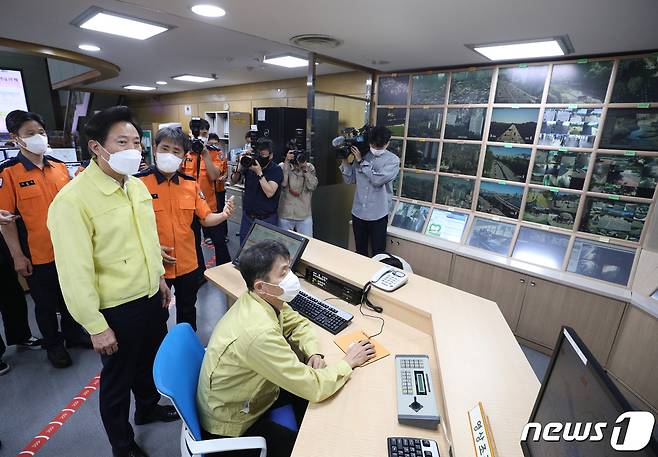 (서울=뉴스1) 신웅수 기자 = 오세훈 서울시장이 추석 연휴 첫날인 18일 오전 서울 중구 서울종합방재센터를 방문해 CCTV를 살펴보고 있다.