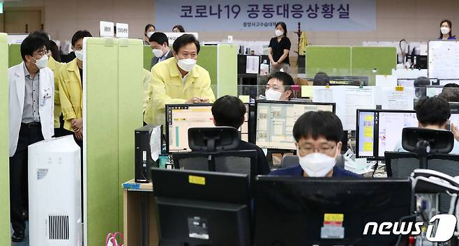 (서울=뉴스1) 신웅수 기자 = 오세훈 서울시장이 18일 오전 서울 중구 국립중앙의료원 코로나19 공동대응상황실을 찾아 직원들을 격려하고 있다. 2021.9.19/뉴스1