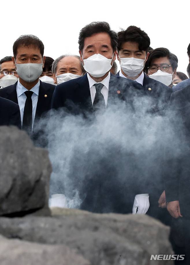 [제주=뉴시스] 우장호 기자 = 더불어민주당 대권주자인 이낙연 전 대표가 18일 오전 제주시 봉개동 제주4·3평화공원을 방문해 희생영령에게 참배하고 있다. 2021.09.18. woo1223@newsis.com