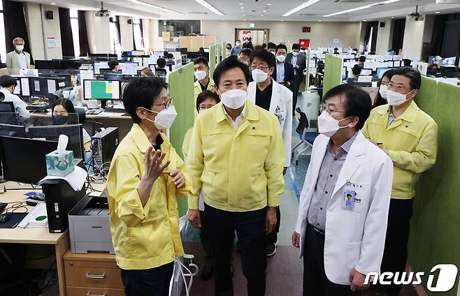 (서울=뉴스1) 신웅수 기자 = 오세훈 서울시장이 18일 오전 서울 중구 국립중앙의료원 코로나19 공동대응상황실을 찾아 추석연휴 코로나19 대응사항을 점검하고 있다 2021.9.18/뉴스1