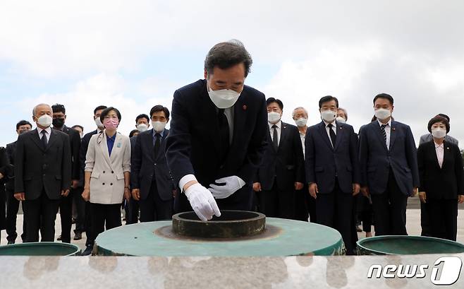 (제주=뉴스1) 홍수영 기자 = 18일 이낙연 더불어민주당 대선 경선 후보가 제주4·3평화공원에서 참배하고 있다.2021.9.18/뉴스1