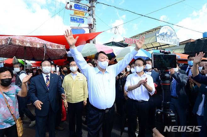 [창녕=뉴시스] 차용현 기자 = 추석을 앞두고 경남지역 민심 끌어안기에 나선 국민의 힘 윤석열 대선경선 주자가 18일 오전 창녕군 소재 창녕상설시장을 찾아 환호하는 지지자들을 향해 손을 들어 인사하고 있다. 2021.09.18. con@newsis.com