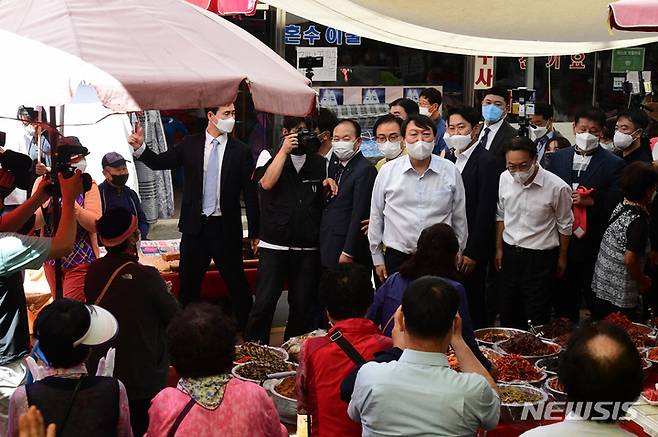 [창녕=뉴시스] 차용현 기자 = 추석을 앞두고 경남지역 민심 끌어안기에 나선 국민의 힘 윤석열 대선경선 주자가 18일 오전 창녕군 소재 창녕상설시장을 찾아 시장내부를 둘러보며 상인들과 인사를 하고 있다. 2021.09.18. con@newsis.com
