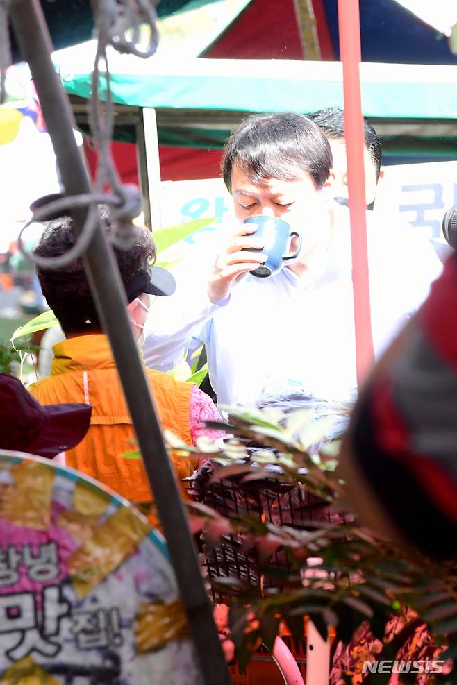 [창녕=뉴시스] 차용현 기자 = 추석을 앞두고 경남지역 민심 끌어안기에 나선 국민의 힘 윤석열 대선경선 주자가 18일 오전 창녕군 소재 창녕상설시장을 찾아 시장내부를 둘러보다 한 상인이 건넨 물을 마시고 있다. 2021.09.18. con@newsis.com