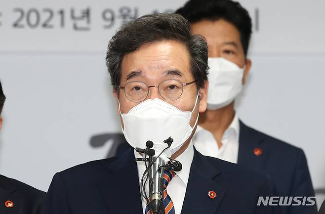 [제주=뉴시스] 우장호 기자 = 더불어민주당 대권주자인 이낙연 전 대표가 18일 오전 제주시 이도2동 민주당 도당사에서 제주지역 공약 발표 기자회견을 하고 있다. 2021.09.18. woo1223@newsis.com