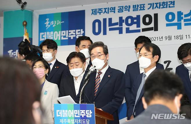 [제주=뉴시스] 우장호 기자 = 더불어민주당 대권주자인 이낙연 전 대표가 18일 오전 제주시 이도2동 민주당 도당사에서 제주지역 공약 발표 기자회견을 하고 있다. 2021.09.18. woo1223@newsis.com