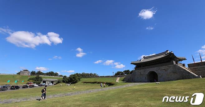 (수원=뉴스1) 김영운 기자 = 추석 명절 연휴가 시작된 18일 오전 경기도 수원시 팔달구 수원화성 창룡문에서 나들이 나온 시민들이 파란 가을 하늘 아래를 걷고 있다. 2021.9.18/뉴스1