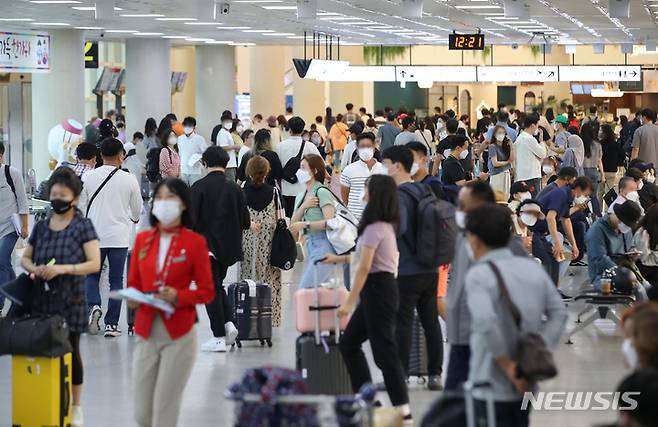 [제주=뉴시스] 우장호 기자 = 추석 연휴 첫날인 18일 오후 제주국제공항 1층 도착장이 제주에서 명절 연휴를 보내려는 가족과 친구, 연인들로 북적이고 있다. 2021.09.18. woo1223@newsis.com