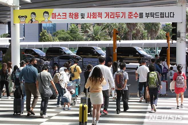 [제주=뉴시스] 우장호 기자 = 추석 연휴 첫날인 18일 오후 제주국제공항 1층 도착장이 제주에서 명절 연휴를 보내려는 가족과 친구, 연인들로 북적이고 있다. 2021.09.18. woo1223@newsis.com