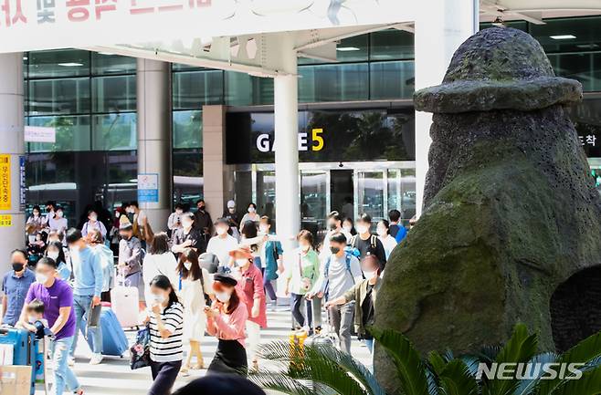 [제주=뉴시스] 우장호 기자 = 추석 연휴 첫날인 18일 오후 제주국제공항 1층 도착장이 제주에서 명절 연휴를 보내려는 가족과 친구, 연인들로 북적이고 있다. 2021.09.18. woo1223@newsis.com