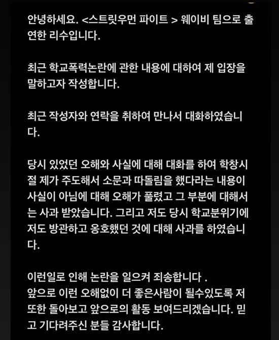 최근 한 온라인 커뮤니티를 통해 Mnet '스트릿 우먼 파이터' 출연 중인 웨이비 소속 리수에게 학교 폭력 피해를 입었다는 피해자가 글을 남겨 논란이 커졌다. 작성자는 리수가 자신에 대한 근거 없는 소문을 퍼뜨렸으며 폭언을 듣기도 했다고 폭로했다.