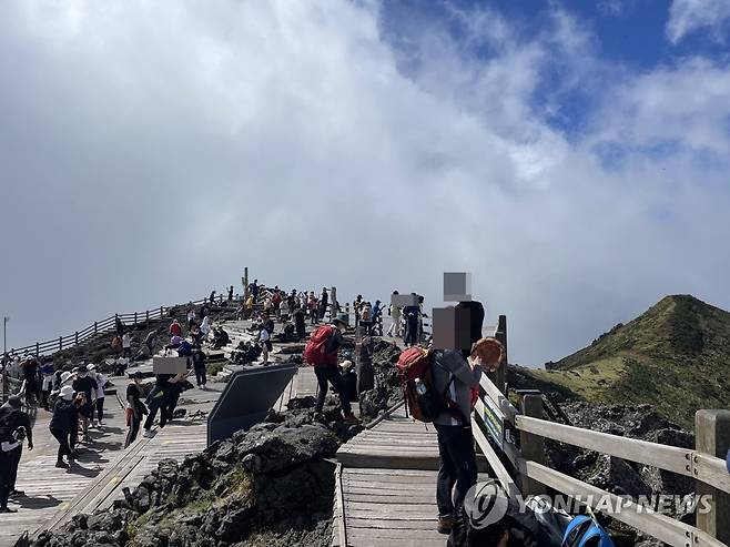 (제주=연합뉴스) 태풍 찬투가 물러간 18일 오전 한라산 백록담 정상에 많은 등산객이 찾아 산행을 즐기로 있다. 2021.9.18 [독자 고원상씨 제공. 재판매 및 DB 금지]