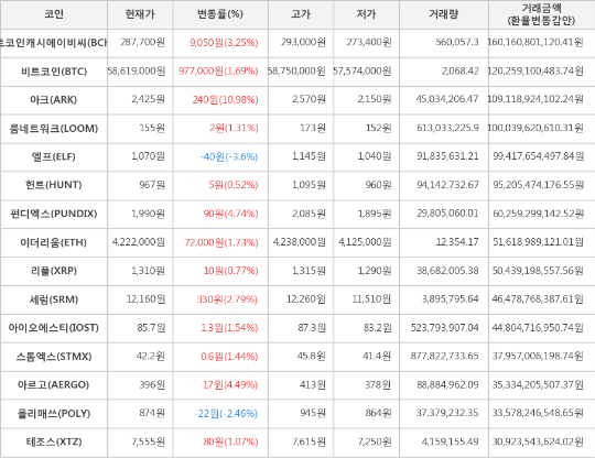 [표]가상화폐 시세 (제공: 암호화폐 거래소 업비트)