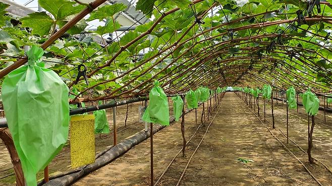 | ▲ 샤인머스켓 농장 샤인머스켓이 봉지에 씌워져 자라고 있다. |