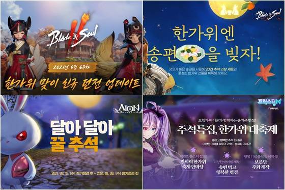 ‘아이온’은 클래식 서버와 라이브 서버로 구분해 진행한다. 10월 6일까지 클래식 서버에서는 ‘달아 달아 꿀추석’ 이벤트를 진행되고 라이브 서버에서는 ‘아프사란타 캐치문’ 이벤트가 열린다. ‘블레이드&소울’에서도 10월 13일까지 ‘한가위엔 송편을 빚자!’ 이벤트를 통해 ‘홍문 경험치 부적, 축복받은 천부해방석’ 등의 보상을 받을 수 있다.