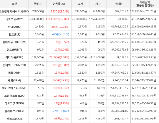 [표]가상화폐 시세 (제공: 암호화폐 거래소 업비트)