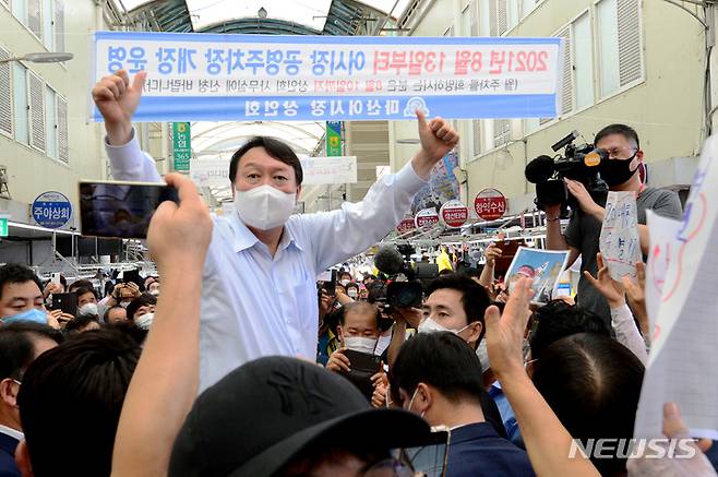 [창원=뉴시스] 차용현 기자 = 추석을 앞두고 경남지역 민심 끌어안기에 나선 국민의 힘 윤석열 대선경선 후보가 18일 오후 창원시 마산합포구 소재 마산어시장을 찾아 환호하는 지지자들을 향해 손을 들어 인사하고 있다. 2021.09.18. con@newsis.com