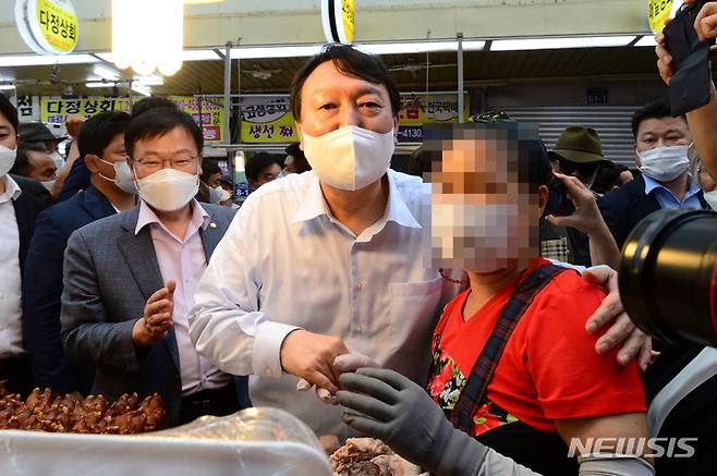[창원=뉴시스] 차용현 기자 = 추석을 앞두고 경남지역 민심 끌어안기에 나선 국민의 힘 윤석열 대선경선 후보가 18일 오후 창원시 마산합포구 소재 마산어시장을 찾아 시장내부를 둘러보며 상인들과 인사를 하고 있다. 2021.09.18. con@newsis.com