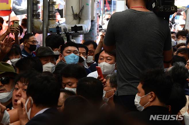 [창원=뉴시스] 차용현 기자 = 추석을 앞두고 경남지역 민심 끌어안기에 나선 국민의 힘 윤석열 대선경선 주자가 18일 오후 창원시 마산합포구 소재 마산어시장을 찾아 지지자들의 환호를 받으며 시장으로 들어서고 있다. 2021.09.18. con@newsis.com