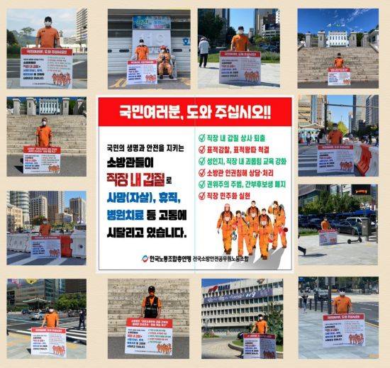 한국노총 공무원연맹 산하 전국소방안전공무원노동조합(이하 소방안전노조 위원장 홍순탁)은 최근 발생한 대전소방본부 동료 소방관의 갑질 횡포에 따른 참담한 심정을 금할 길이 없으며, 고인의 명복과 유가족에 대한 심심한 위로의 말씀을 전하고 성명서를 발표, 9월13일부터 시작된 5일간의 광화문과 각 지역본부의 1인 릴레이 시위를 9월17일 마무리하였다.