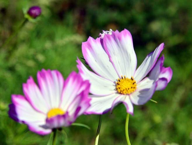 Beds of purple cosmos and bright yellow sunflowers dance to the soft breeze, splashing the landscape with life.