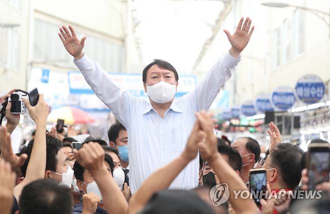 (창원=연합뉴스) 김동민 기자 = 국민의힘 대선 경선 예비후보인 윤석열 전 검찰총장이 18일 오후 경남 창원시 마산합포구 마산어시장을 찾아 상인들에게 인사하고 있다. 2021.9.18