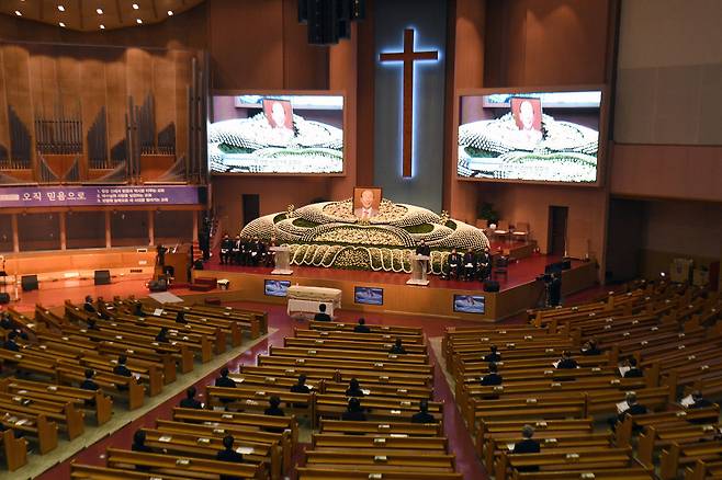 (서울=뉴스1) = 18일 서울 여의도순복음교회 대성전에서 고 조용기 원로목사의 천국환송예배가 열리고 있다. (국민일보 제공) 2021.9.18/뉴스1