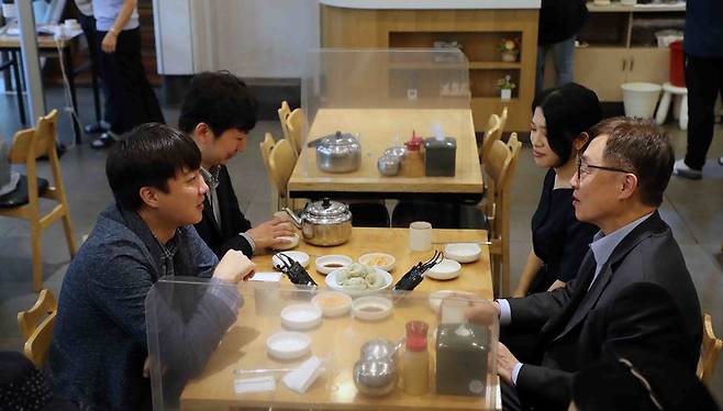 국민의힘 이준석 대표가 18일 오후 서울 중구의 한 냉면전문점에서 최재형 대선 경선 예비후보와 오찬회동을 하고 있다.(서울=연합뉴스)