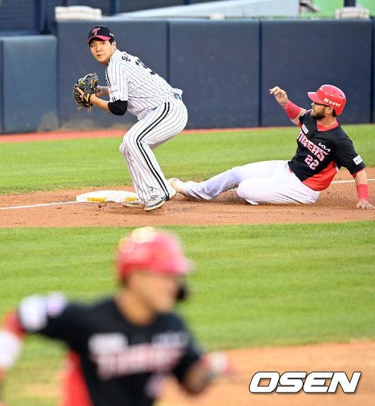 4회초 무사 1,2루 LG 3루수 문보경이 KIA 한승택의 번트 타구를 잡아 2루주자 터커를 포스아웃 시킨 뒤 1루로 송구하고 있다. 한승택은 세이프. 2021.09.18 /cej@osen.co.kr